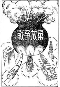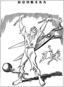 As Japan remade itself into a peaceful nation, many Japanese remembered that they had needed an outside force to bring their freedom into existence. The residents of Nagasaki gave a doll in a glass case to the Americans, and even sponsored a “Miss Atomic Bomb” contest.94 A cartoonist depicted his shackles being cut by U.S. Air Force scissors; he commented: “We must not forget that we did not shed a drop of blood, or raise a sweat, to cut those chains.” The cartoonist himself had drawn virulent propaganda cartoons before the war; once liberated from government censors by the Americans, he began using his pen for a noble purpose.