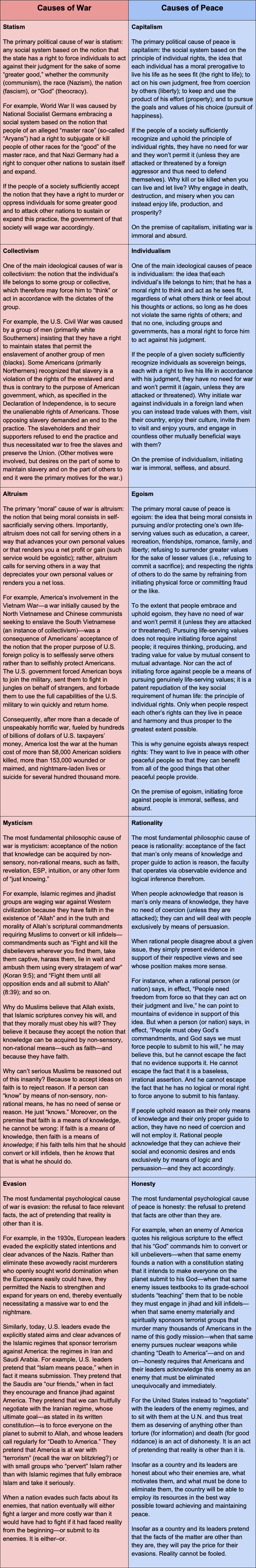 In terms of fundamentals, both war and peace are consequences of certain ideas and aims, which, when sufficiently accepted as true or good by the people of a given society, give rise to corresponding norms and policies that, in turn, either lead to war or enable peace. The fundamental causes of war are statism, collectivism, altruism, mysticism, and evasion; those of peace are capitalism, individualism, egoism, rationality, and honesty.